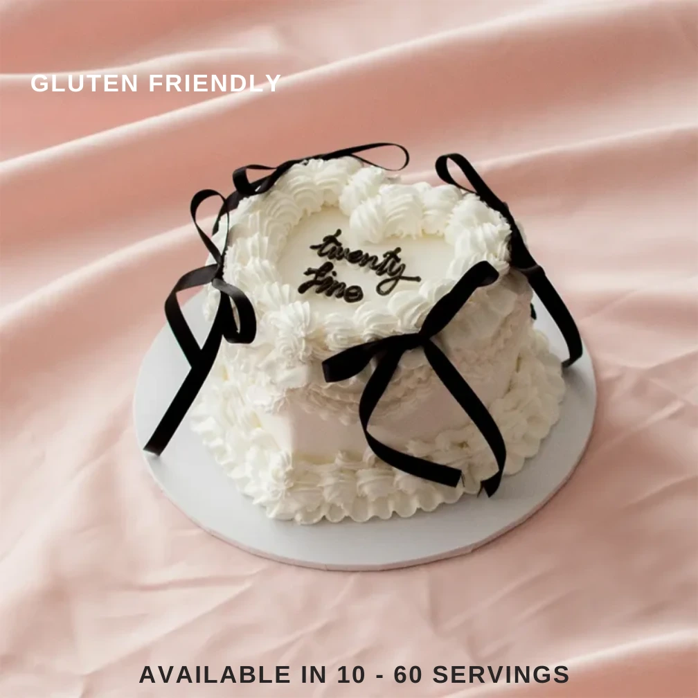 Our Vintage Retro Ribbon Heart GF Cake features a delicately piped love heart design adorned with elegant ribbons, creating a chic and timeless aesthetic. In addition, the single-colour finish paired with bold black ribbons adds a refined and sophisticated touch.